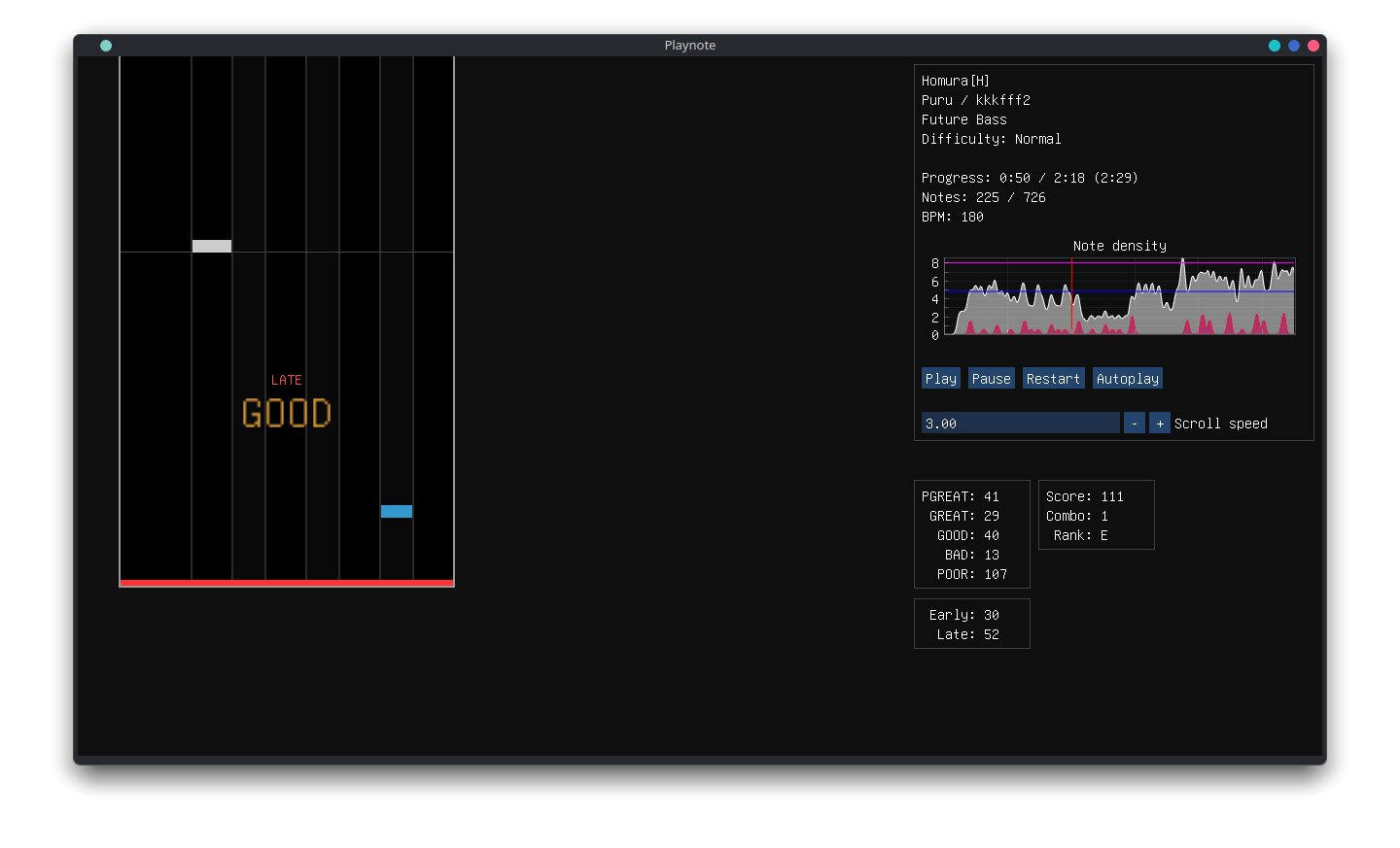 It’s being developed in C++23 for Windows and Linux, with a custom audio engine and Vulkan for graphics. Currently, it can load one BMS chart at a time via the command line, and allows you to play it yourself (with a keyboard or a controller) or watch a perfect autoplay. Most charts work, though there are edge cases, and a few uncommon BMS features, like mines and control flow, aren’t yet supported.